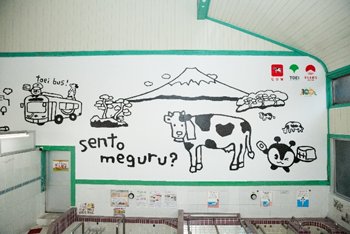An original event illustration on the wall at Kotobuki-yu Public Bath in Higashi Ueno