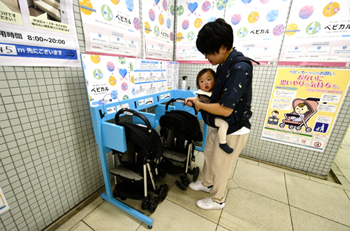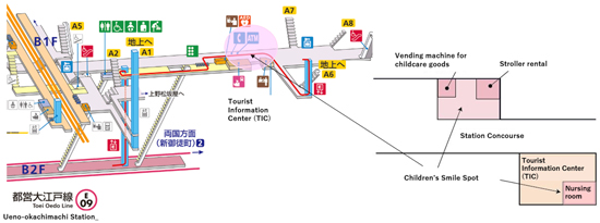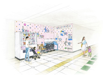 Ueno-okachimachi station already provides several amenities for those going out with babies and toddlers. In February of this year, a nursing room was installed inside the station. In April, it became the first subway station in Japan to offer a stroller rental service. Children’s Smile Spot will include both of these services, plus a newly installed vending machine, from which parents can purchase childcare products, such as liquid baby formula and disposable diapers. The area will also feature a distinctive design to make it easier to find.