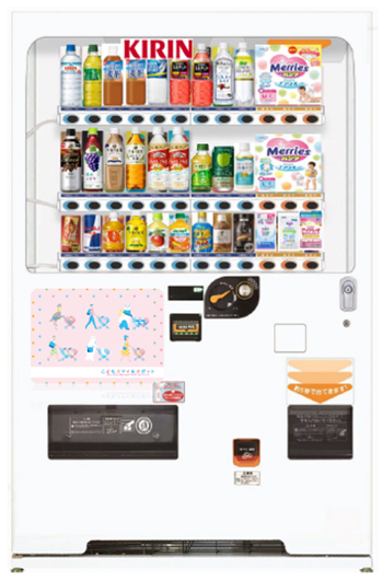 A mother with her baby in her arms is about to buy some childcare products at a vending machine. One of such a vending machine will be installed at ‘Children’s Smile Spot’ at Ueno-okachimachi subway station, too. Even liquid baby formula and disposable diapers will be available.