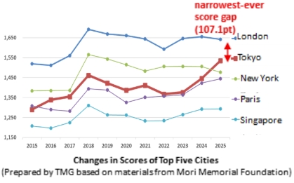 TOKYO, December 17, 2025 – The Tokyo Metropolitan Government (TMG) announced that Tokyo has secured its first-ever second-place ranking, surpassing New York, as well as its narrowest-ever score gap behind top-ranked London, in the Global Power City Index 2025 (GPCI-2025). The index, published annually since 2008 by the Mori Memorial Foundation’s Institute for Urban Strategies, evaluates the urban competitiveness of 48 cities worldwide.
